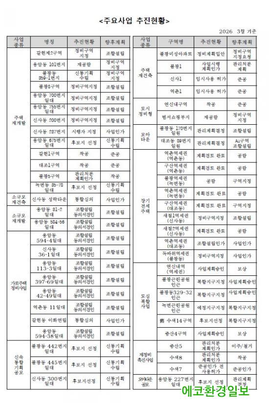ÇöÀç ±¸ ³» Á¤ºñ»ç¾÷Àº °ËÅäµÇ°í ÀÖ´Â Áö¿ªÀ» Æ÷ÇÔÇØ ÃÑ 90¿© °³¼Ò°¡ ¼Óµµ°¨ ÀÖ°Ô ÃßÁø ÁßÀÌ´Ù. ÁÖÅÃÁ¤ºñÇü Àç°³¹ß, µµ½ÃÁ¤ºñÇü Àç°³¹ß, Àç°ÇÃà, µµ½É°ø°øÁÖÅà º¹ÇÕ»ç¾÷, °¡·ÎÁÖÅÃÁ¤ºñ»ç¾÷ µî À¯Çüµµ ´Ù¾çÇÏ´Ù. Áß¾ÓÁ¤ºÎ¿Í ¼¿ï½ÃÀÇ ÁÖÅðø±Þ È®´ë Á¤Ã¥¿¡ µû¶ó Á¤ºñ»ç¾÷ Á¦¾È°ú ÃßÁø ¼ö¿ä´Â Áö¼Ó Áõ°¡ÇÏ´Â Ãß¼¼´Ù.