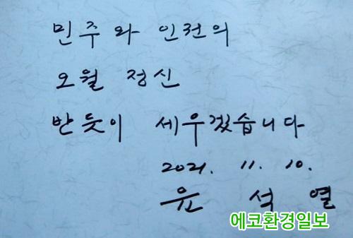 [¿¡ÄÚȯ°æÀϺ¸=Á¤ÁöÀ± ±âÀÚ] À±¼®¿­ ±¹¹ÎÀÇÈû ´ë¼±È帰¡ ±¹¸³ 5¡¤18 ¹ÎÁÖ¹¦Áö¸¦ ¹æ¹®ÇØ ³²±ä ¹æ¸í·ÏÀ» µÎ°í ¸ÂÃã¹ý ³í¶õÀÌ ºÒ°ÅÁ³´Ù.