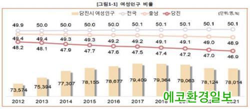 Åë°èÀÚ·á¿¡ µû¸£¸é 2021³â 5¿ù ¸» ±âÁØ, ´çÁø½Ã ¿©¼ºÀα¸´Â 7¸¸8014¸íÀ¸·Î Àüü Àα¸ 16¸¸6491¸í Áß 46.9%¸¦ Â÷Ä¡ÇØ 2018³â(47.35%), 2019³â(47.22%), 2020³â(47.03%) ´ëºñ ¼ÒÆø °¨¼ÒÇÑ °ÍÀ¸·Î ³ªÅ¸³µ´Ù.