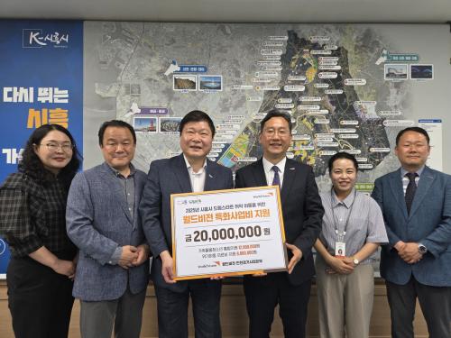 [¿¡ÄÚȯ°æÀϺ¸ ½ÃÈï½Ã=À̽ŵ¿±âÀÚ] ½ÃÈï½Ã´Â 5¿ù 20ÀÏ ½Ãû ºÎ½ÃÀå½Ç¿¡¼­ ¿ùµåºñÀü ÀÎõ°æ±â»ç¾÷º»ºÎ¿Í ÇÔ²² Áö¿ª ³» Ãë¾à¾Æµ¿ Áö¿øÀ» À§ÇÑ ¾÷¹«Çù¾àÀ» ü°áÇϰí, ÃÑ 2õ¸¸ ¿øÀÇ Áö¿ø±Ý Àü´Þ½ÄÀ» ÁøÇàÇß´Ù. À̳¯ Çù¾à½Ä¿¡´Â ¹Ú½Â»ï ½ÃÈï½Ã ºÎ½ÃÀå°ú ÇÑÁ¤¿ì ¿ùµåºñÀü ¡¦