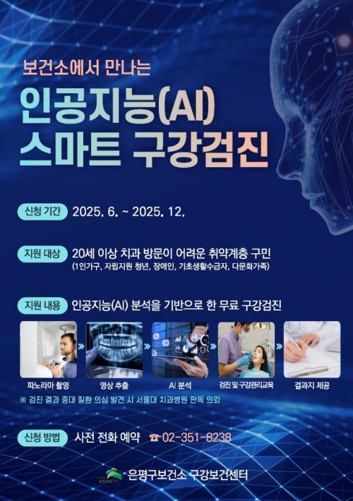 [¿¡ÄÚȯ°æÀϺ¸ ÀºÆò±¸=À̽ŵ¿±âÀÚ] ¼­¿ï ÀºÆò±¸´Â º¸°Ç¼Ò¿¡¼­ ÀΰøÁö´É(AI) ºÐ¼®À» ±â¹ÝÀ¸·Î ÇÑ ¡®½º¸¶Æ® ±¸°­°ËÁø °ü¸® ½Ã½ºÅÛ¡¯À» ³»´ÞºÎÅÍ º»°Ý ¿î¿µÇϰí 22ÀϺÎÅÍ »çÀü ÀüÈ­ Á¢¼öÇÑ´Ù°í ¹àÇû´Ù. ±¸°­Áúȯ Áß Ä¡ÁÖÁúȯÀº ½Åü °Ç°­°úµµ ¹ÐÁ¢ÇÑ ¿¬°üÀÌ ÀÖÀ¸¸ç, ´ç´¢¡¦