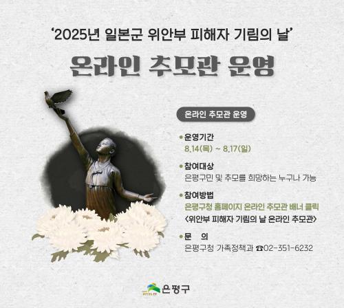 [¿¡ÄÚȯ°æÀϺ¸ ÀºÆò±¸=À̽ŵ¿±âÀÚ] ¼­¿ï ÀºÆò±¸´Â ¡®ÀϺ»±º À§¾ÈºÎ ÇÇÇØÀÚ ±â¸²ÀÇ ³¯¡¯À» ¸ÂÀÌÇØ Áö³­ 14ÀϺÎÅÍ 17ÀϱîÁö 4Àϰ£ ¡®2025³â À§¾ÈºÎ ÇÇÇØÀÚ ±â¸²ÀÇ ³¯ ¿Â¶óÀÎ Ã߸ð°ü¡¯À» ¿î¿µÇß´Ù°í ¹àÇû´Ù. ±¸´Â Áö³­ 14ÀÏ ÀºÆòÆòÈ­°ø¿ø¿¡¼­ ÇåÈ­, Çå½Ã³¶µ¶, À§¾ÈºÎ °ü¡¦