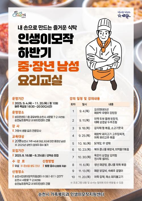 [¿¡ÄÚȯ°æÀϺ¸ ¼øÃµ=±è¿ëÈÆ ±âÀÚ] ¼øÃµ½Ã(½ÃÀå ³ë°ü±Ô)´Â ¿À´Â 9¿ù 4ÀϺÎÅÍ 11¿ù 20ÀϱîÁö 3°³¿ù°£ ¼øÃµ½Ã °ÅÁÖ Áß¡¤Àå³â ³²¼º(46¼¼ ÀÌ»ó 65¼¼ ¹Ì¸¸) 20¸íÀ» ´ë»óÀ¸·Î ¸ÅÁÖ ¸ñ¿äÀÏ Àú³á 18:30ºÎÅÍ 20:30±îÁö 1ȸ 2½Ã°£, 10ȸ±â °úÁ¤À¸·Î ³²¼º ¿ä¸® ±³½ÇÀ» ¿î¿µÇÑ´Ù. ¡¦
