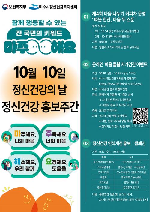 [¿¡ÄÚȯ°æÀϺ¸ ¿©¼ö=±è±â³² ±âÀÚ] ¿©¼ö½Ã(½ÃÀå Á¤±â¸í)´Â Á¤½Å°Ç°­ÀÇ ³¯(10¿ù 10ÀÏ)À» ±â³äÇØ 10¿ù 10ÀϺÎÅÍ 24ÀϱîÁö ¡®2025³â Á¤½Å°Ç°­ È«º¸ÁÖ°£¡¯À» ¿î¿µÇÑ´Ù. À̹ø È«º¸ÁÖ°£Àº ¡®¸¶ÁÖÇØ¿ä: Á¤½Å°Ç°­Àº ¸¶ÁÖÇϸ鼭 ½ÃÀÛÇÕ´Ï´Ù¡¯¸¦ ½½·Î°ÇÀ¸·Î, ½Ã¹ÎÀÇ Á¤½Å°Ç°­ Áõ¡¦