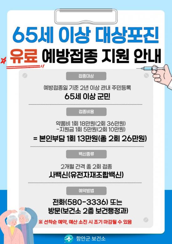 [¿¡ÄÚȯ°æÀϺ¸ °æ³²ÇÔ¾È=À̽ŵ¿±âÀÚ] ÇԾȱºº¸°Ç¼Ò´Â 2026³â ´ë»óÆ÷Áø ¿¹¹æÁ¢Á¾À» 1¿ù 2ÀϺÎÅÍ ¿¹¾à Á¢¼öÇϸç, Á¢Á¾ ½Ç½Ã´Â 2¿ùºÎÅÍ ÁøÇàÇÑ´Ù°í ¹àÇû´Ù. Á¢Á¾ ´ë»óÀº ¿¹¹æÁ¢Á¾ÀÏ ±âÁØÀ¸·Î 2³â ÀÌ»ó °ü³» Áֹεî·ÏÀ» µÎ°í °ÅÁÖÇÑ 65¼¼ ÀÌ»ó ÁÖ¹ÎÀÌ´Ù. Á¢Á¾À» Èñ¸ÁÇÏ¡¦