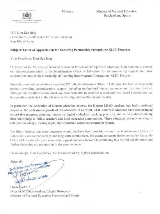 [¿¡ÄÚȯ°æÀϺ¸ Àü³²=À̽ŵ¿±âÀÚ] Àü¶ó³²µµ±³À°Ã»Àº ±³À° Á¤º¸È­ Áö¿ø »ç¾÷°ú °ü·ÃÇØ ¸ð·ÎÄÚ ±³À°ºÎ·ÎºÎÅÍ °ø½Ä °¨»ç ¼­ÇÑÀ» ¹Þ°í, ±¹Á¦±³À° Çù·ÂÀÇ ½Å·Ú¿Í ¼º°ú¸¦ ´Ù½Ã Çѹø È®ÀÎÇß´Ù. À̹ø °¨»ç ¼­ÇÑÀº Àü¶ó³²µµ±³À°Ã»ÀÌ 2021³âºÎÅÍ ±³À° Á¤º¸È­ Áö¿ø »ç¾÷ (KLIC¡¦