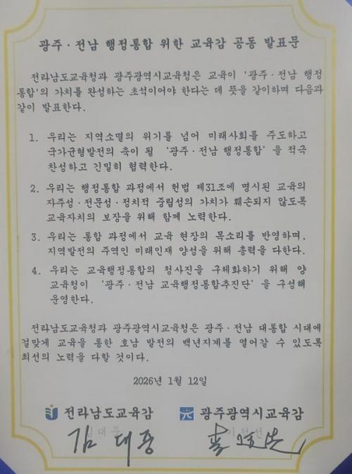 [¿¡ÄÚȯ°æÀϺ¸ Àü³²=À̽ŵ¿±âÀÚ] Àü¶ó³²µµ±³À°Ã»°ú ±¤ÁÖ±¤¿ª½Ã±³À°Ã»ÀÌ 12ÀÏ ±¤ÁÖ¡¤Àü³² ÇàÁ¤ ÅëÇÕ¿¡ Âù¼ºÇϰí Çù·ÂÀ» ´ÙÁüÇÏ´Â °øµ¿¹ßÇ¥¹®À» äÅÃÇß´Ù. ±è´ëÁß ±³À°°¨°ú ÀÌÁ¤¼± ±³À°°¨Àº À̳¯ ¿ÀÀü ±¤ÁÖ±³À°Ã»¿¡¼­ ¸¸³ª ÃÖ±Ù ³íÀǵǰí ÀÖ´Â ±¤ÁÖ¡¤Àü³² ÅëÇÕ°ú °ü·Ã¡¦