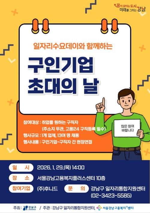 [¿¡ÄÚȯ°æÀϺ¸ °­³²±¸=À̽ŵ¿±âÀÚ] ²ÞÀÌ ¸ðÀÌ´Â µµ½Ã, ¹Ì·¡¸¦ ±×¸®´Â °­³²±¸°¡ ±¸Àαâ¾÷°ú ±¸Á÷ÀÚ¸¦ ÇöÀå¿¡¼­ ¿¬°áÇÏ´Â ¼Ò±Ô¸ð ä¿ë Çà»ç ¡®±¸Àαâ¾÷ ÃÊ´ëÀÇ ³¯¡¯À» ±â¾÷ ¼ö¿ä¿¡ ¸ÂÃá ¼ö½Ã ¿î¿µ ¹æ½ÄÀ¸·Î °³ÆíÇϰí, ¿À´Â 1¿ù 29ÀÏ ¿ÀÈÄ 2½Ã ¼­¿ï°­³²°í¿ëº¹ÁöÇ÷¯½º¼¾ÅÍ¡¦