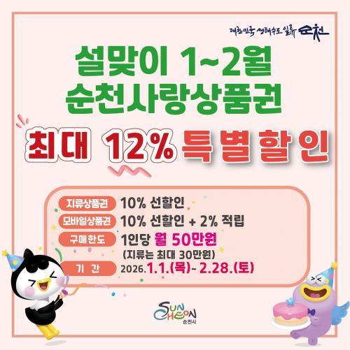 [¿¡ÄÚȯ°æÀϺ¸ ¼øÃµ=±è¿ëÈÆ ±âÀÚ] ¼øÃµ½Ã´Â ½Ã¹ÎµéÀÇ Àå¹Ù±¸´Ï ºÎ´ãÀ» ´ú°í Áö¿ª ³» ¼Òºñ¸¦ ÃËÁøÇϱâ À§ÇØ 1¿ùºÎÅÍ ÃßÁø ÁßÀÎ ¼øÃµ»ç¶û»óǰ±Ç ÇÒÀÎÇà»ç¸¦ ¼³ ¸íÀýÀ» Æ÷ÇÔÇØ 2¿ù ¸»±îÁö Áö¼Ó ¿î¿µÇÑ´Ù°í ¹àÇû´Ù. ½Ã¿¡ µû¸£¸é 2026³â 1¿ùºÎÅÍ ÁøÇà ÁßÀÎ ¼øÃµ»ç¶û»óǰ¡¦