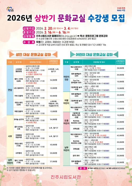 [¿¡ÄÚȯ°æÀϺ¸ °æ³²ÁøÁÖ=³²±Ã¿µ±â±âÀÚ] ÁøÁֽø³µµ¼­°üÀº ¿À´Â 20ÀϺÎÅÍ ¾î¸°ÀÌ¿Í ¼ºÀÎÀ» ´ë»óÀ¸·Î ¡®2026³â »ó¹Ý±â ¹®È­±³½Ç¡¯ ¼ö°­»ýÀ» ¸ðÁýÇÑ´Ù. ¡®¾î¸°ÀÌ ¹®È­±³½Ç¡¯Àº 3¿ù 16ÀϺÎÅÍ 5¿ù 18ÀϱîÁö ¾î¸°ÀÌÀü¹®¡¤µµµ¿¾î¸°ÀÌ¡¤ºñºÀ¾î¸°ÀÌ¡¤³²ºÎ¾î¸°À̵µ¼­°ü¿¡¼­ °úÇС¦