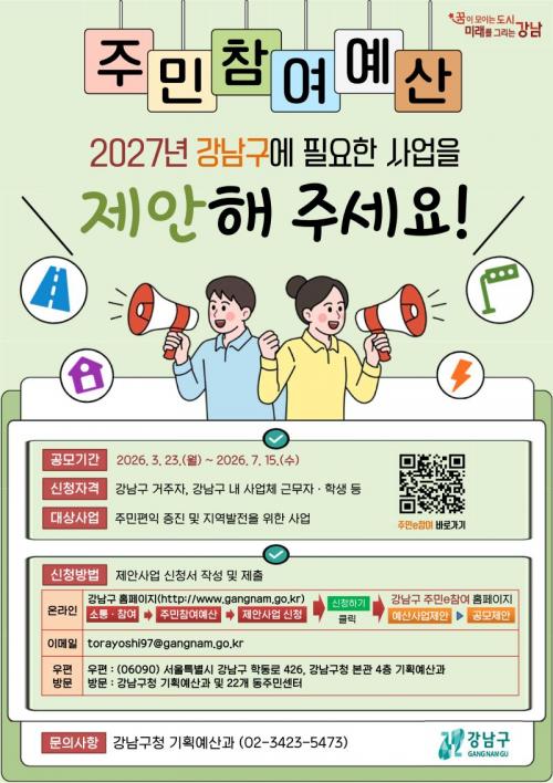 [¿¡ÄÚȯ°æÀϺ¸ °­³²±¸=À̽ŵ¿±âÀÚ] ²ÞÀÌ ¸ðÀÌ´Â µµ½Ã, ¹Ì·¡¸¦ ±×¸®´Â °­³²±¸°¡ 2027³âµµ ¿¹»êÆí¼º¿¡ ¹Ý¿µÇÒ ÁÖ¹ÎÂü¿©¿¹»ê Á¦¾È»ç¾÷ °ø¸ð¸¦ 3¿ù 23ÀϺÎÅÍ 7¿ù 15ÀϱîÁö ÁøÇàÇÑ´Ù. ¿ÃÇØ °ø¸ð ±Ô¸ð´Â ÃÑ 13¾ï ¿øÀ¸·Î, ÁÖ¹ÎÀÌ Á÷Á¢ »ýȰ ¼Ó ºÒÆíÀ» ÇØ°áÇϰí Áö¿ª¿¡ ÇÊ¿äÇÑ »ç¡¦