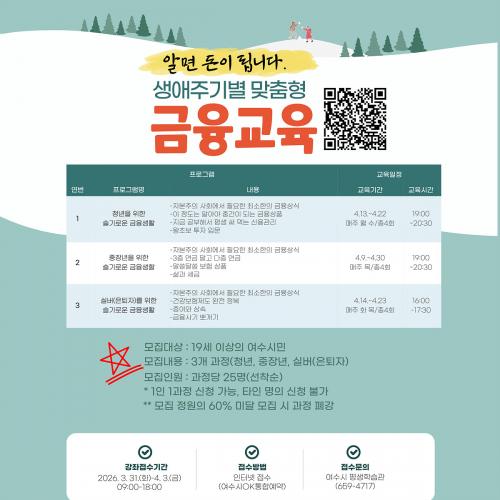 [¿¡ÄÚȯ°æÀϺ¸ ¿©¼ö=±è±â³² ±âÀÚ] ¿©¼ö½Ã´Â ½Ã¹ÎµéÀÇ ±ÝÀ¶ ÀÌÇØµµ Çâ»óÀ» À§ÇØ »ý¾ÖÁֱ⺰ ¸ÂÃãÇü ±ÝÀ¶±³À° Âü¿©ÀÚ¸¦ ¸ðÁýÇÑ´Ù°í ¹àÇû´Ù. À̹ø ±³À°Àº ±ÝÀ¶ ±âÃʺÎÅÍ ÅõÀÚ, ¼¼±Ý, Áõ¿© µî ±¸Ã¼ÀûÀÌ°í ½Ç»ýȰ¿¡ ¹Ù·Î Àû¿ëÇÒ ¼ö ÀÖ´Â ³»¿ëÀ¸·Î ±¸¼ºµÈ ¸ÂÃãÇü ÇÁ·ÎÁ§Æ®¡¦