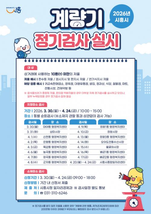[¿¡ÄÚȯ°æÀϺ¸ ½ÃÈï½Ã=À̽ŵ¿±âÀÚ] ½ÃÈï½Ã´Â °øÁ¤ÇÑ »ó°Å·¡ Áú¼­ È®¸³°ú ¼ÒºñÀÚ ±ÇÀÍ º¸È£¸¦ À§ÇØ ¿À´Â 3¿ù 30ÀϺÎÅÍ 4¿ù 24ÀϱîÁö ¡®2026³â °è·®±â(Àú¿ï) Á¤±â °Ë»ç¡¯¸¦ ½Ç½ÃÇÑ´Ù. À̹ø Á¤±â °Ë»ç´Â ¡®°è·®¿¡ °üÇÑ ¹ý·ü¡¯¿¡ µû¶ó 2³â¸¶´Ù ½ÃÇàµÇ´Â ¹ýÁ¤ °Ë»ç·Î, »ó°Å¡¦