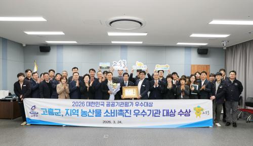 [¿¡ÄÚȯ°æÀϺ¸ Àü³²°íÈï=¹Ú±¤¿Á±âÀÚ] °íÈﱺ(±º¼ö °ø¿µ¹Î)Àº Áö³­ 24ÀÏ ±¹È¸ÀÇ¿øÈ¸°ü ´ëȸÀǽǿ¡¼­ ¿­¸° ¡®2026³â ´ëÇѹα¹ °ø°ø±â°üÆò°¡ ½Ã»ó½Ä¡¯¿¡¼­ Áö¿ª ³ó»ê¹° ¼Òºñ ÃËÁø ¿ì¼ö±â°üÀ¸·Î ¼±Á¤µÅ ¿ì¼ö´ë»óÀ» ¼ö»óÇß´Ù°í ¹àÇû´Ù. À̹ø ¼ö»óÀº ´ëÇѹα¹ ±¹È¸ °ø°ø±â°ü¡¦