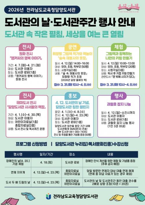 [¿¡ÄÚȯ°æÀϺ¸ Àü³²´ã¾ç=À̽ŵ¿±âÀÚ] Àü¶ó³²µµ±³À°Ã»´ã¾çµµ¼­°üÀº 2026³â µµ¼­°üÀÇ ³¯(4. 12.)°ú µµ¼­°üÁÖ°£À» ¸Â¾Æ 4¿ù 30ÀϱîÁö ´Ù¾çÇÑ µ¶¼­¹®È­ Çà»ç¸¦ ¿î¿µÇÑ´Ù. À̹ø Çà»ç´Â ¡®µµ¼­°ü ¼Ó ÀÛÀº Æîħ, ¼¼»óÀ» ¿©´Â Å« ¿­¸²¡¯À» ÁÖÁ¦·Î Àü½Ã, °ø¿¬, üÇè, È«º¸, Âü¡¦